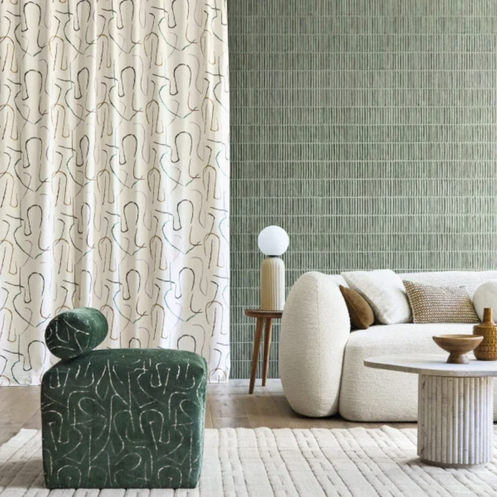 今回ご紹介するファブリックは、柔らかなラインアートが印象的なデザイン。 落ち着いたグリーンの壁面やナチュラルな家具との相性も良く、 大人の空間に上質なリズムを生み出します。
