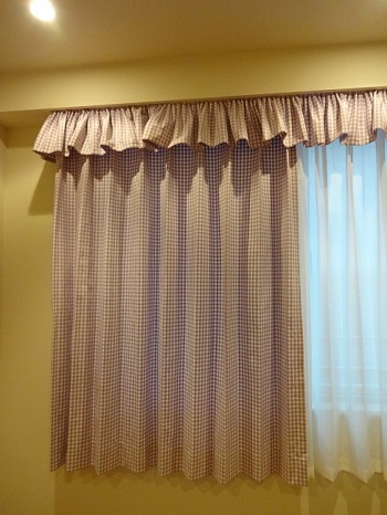 女の子のお部屋は リトルサンダーソンのブックの中から パープルのギンガムをお選びいただき ギャザーバランスとカーテンの組み合わせにしました。