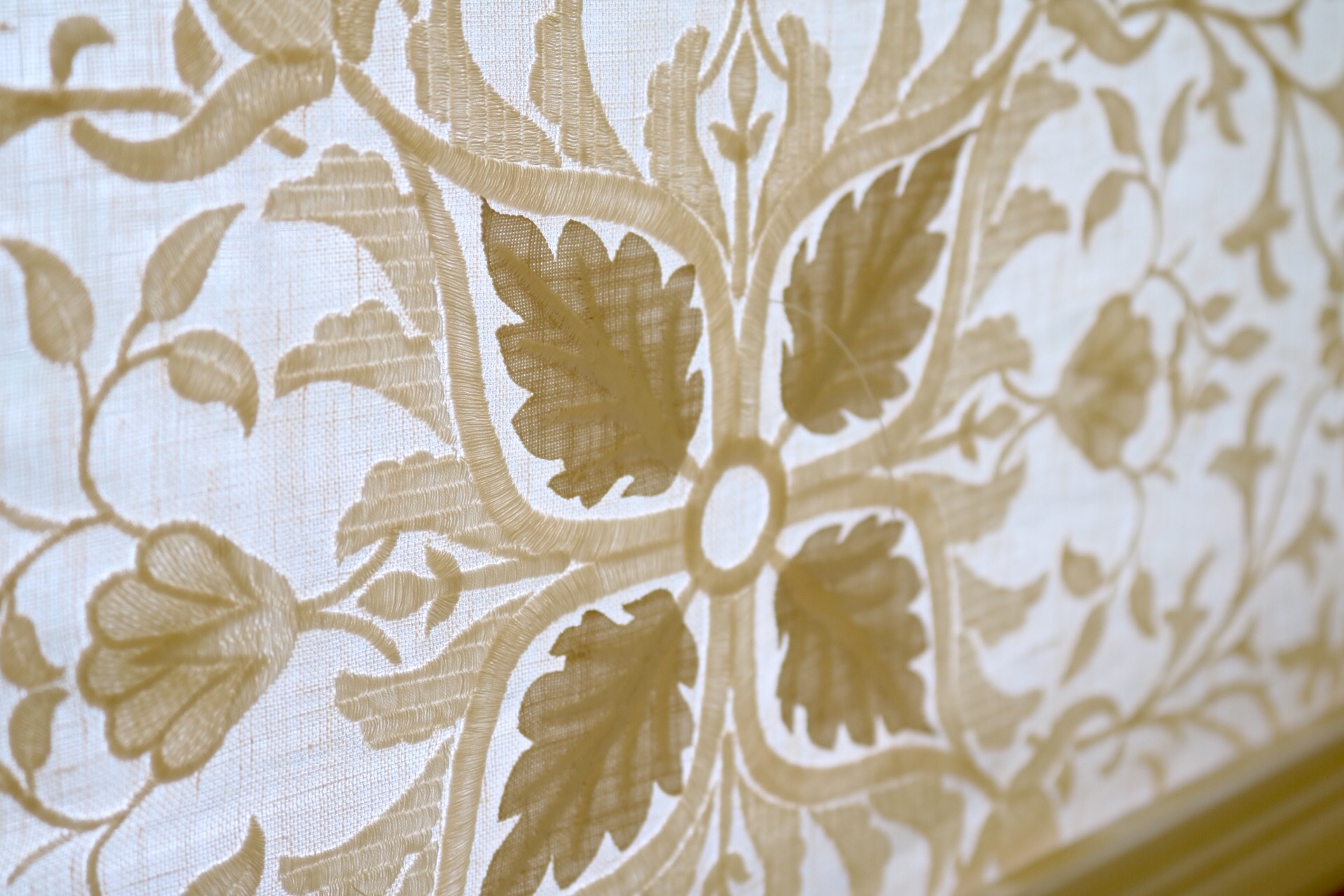 セミシアーの生地に刺繍とレーザーカットのアップリケ装飾が施されたため息が出るような美しいファブリックです。
