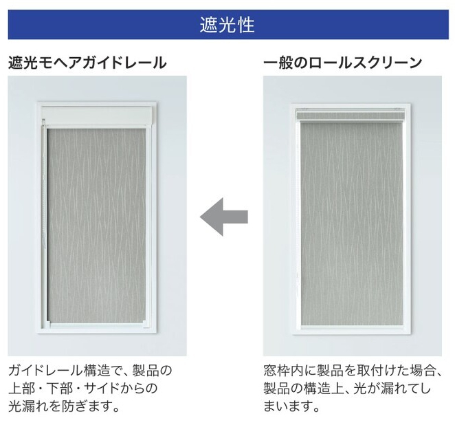 一般的なロールスクリーンでは、スクリーンと窓枠の間にどうしてもわずかな隙間が生じ、そこから光が漏れてしまいます。特に、遮光カーテンを使用していても、両サイドや上部からの光漏れに悩まされ、「光漏れが気になって寝られない」という方は多いでしょう。