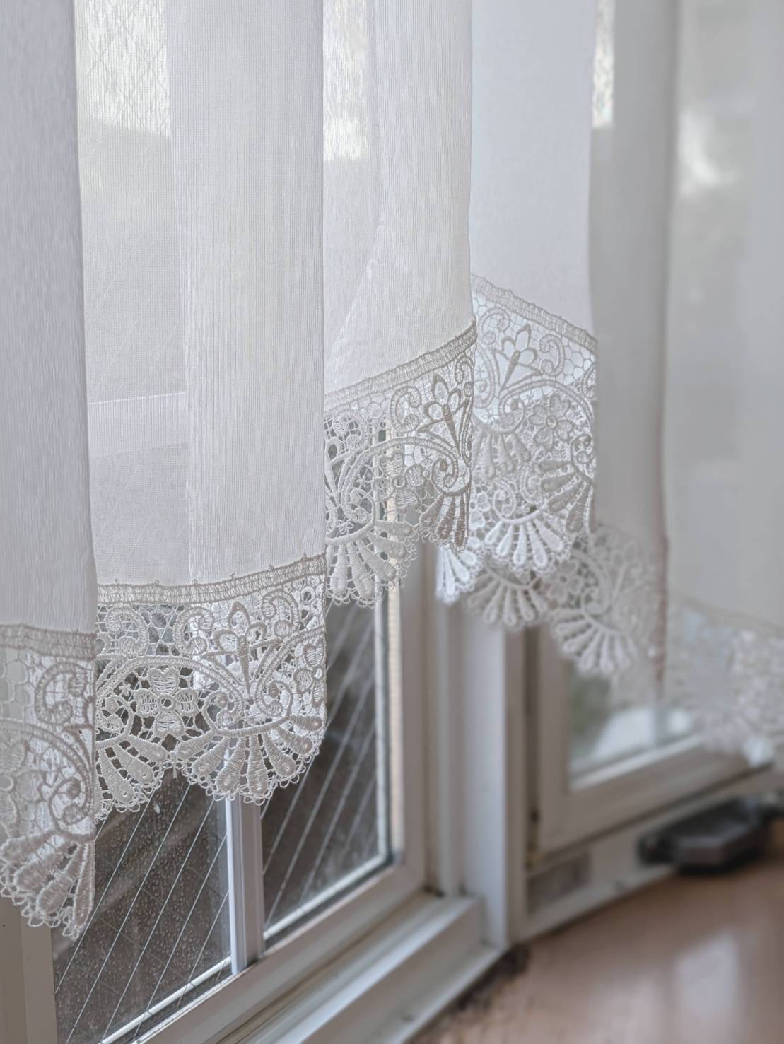 今回のご依頼は、スカラップスタイルのマクラメ付きレースカーテンのお取替えです。お客様は「現在使っているカーテンと同じデザイン」をご希望されており、これまでと変わらない優雅な雰囲気を維持しながら、新しい生地でより美しく仕上げることを目指しました。
