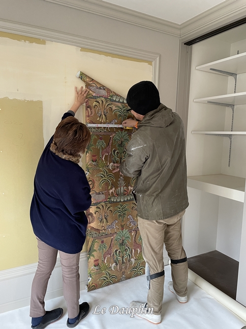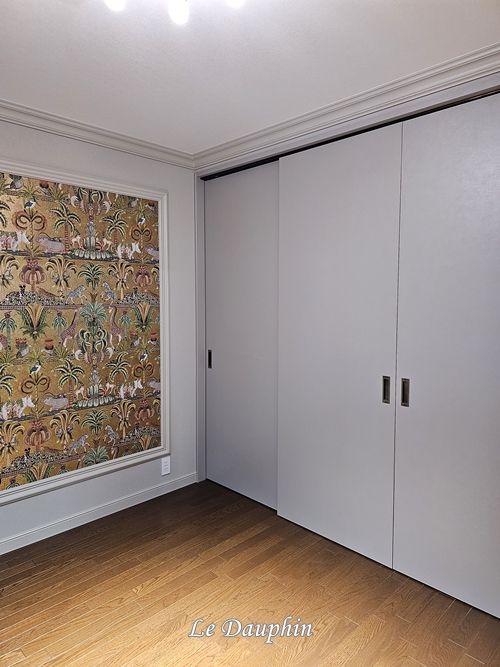 - 質感で魅せる壁面:フレーム用のモールディングに囲まれた部分には、表情豊かなCOLE&SONの壁紙を採用。同じ色調ながら、質感の違いがアクセントとなり、単調さを避けることができました。光の当たり方で表情が変わる、深みのある壁面が高級感を高めます。
